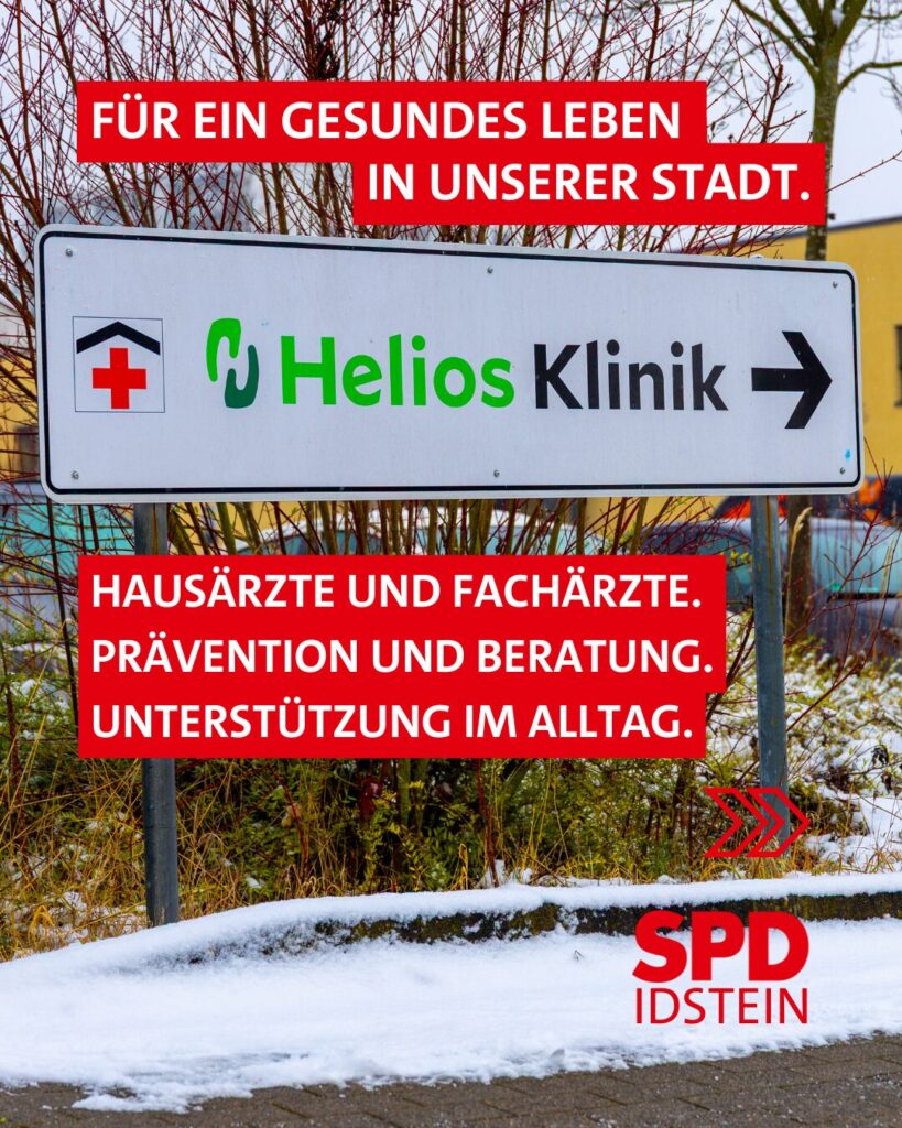 Unsere Gesundheit ist die Grundlage für Lebensqualität und soziale Teilhabe. Als SPD Idstein setzen wir uns dafür ein, dass alle Menschen, unabhängig von Alter oder Wohnort, in unserer Stadt gut medizinisch versorgt sind. Idstein verfügt mit der Hochschule Fresenius, der Helios Klinik und zahlreichen engagierten Akteurinnen und Akteuren bereits über eine starke Basis im Gesundheitsbereich. Dieses Potenzial wollen wir gezielt weiterentwickeln.